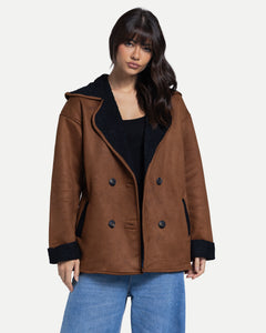 Cozy double-breasted coat with a plush sherpa lining and oversized lapel for a warm, effortless winter feel.