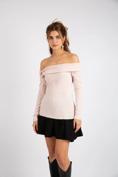 Embrace effortless femininity with The Romantic Bardot Top. Designed to showcase the neckline, this piece features a flattering off-shoulder design with a chic, folded overlay. The long sleeves and fitted silhouette are crafted from a soft-touch knit fabric in a delicate Baby Pink shade, making it perfect for evening events or chic daytime wear.
