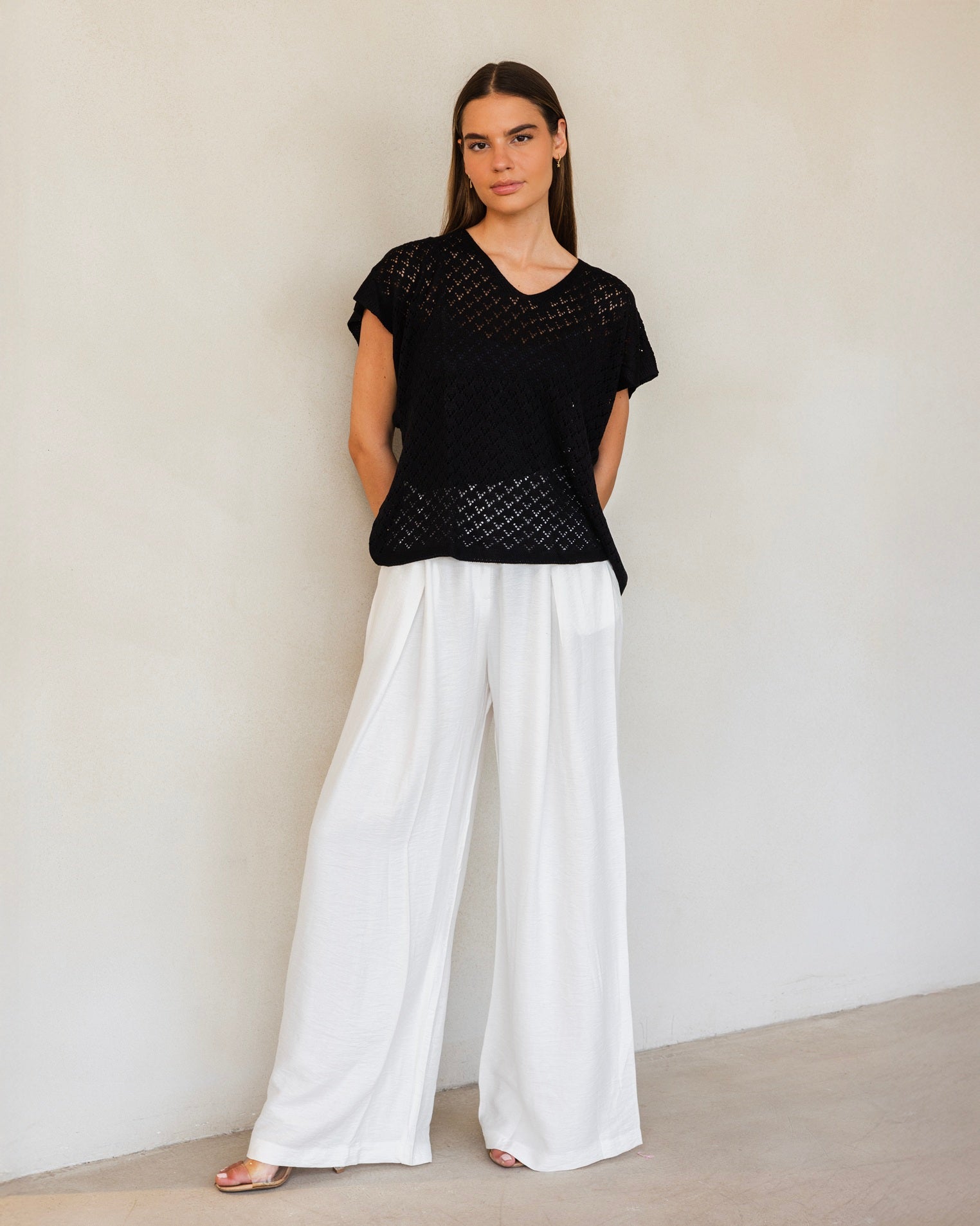 Knitted top with extended shoulder sleeves that gently cover the upper arm, and a flattering V-neckline. Soft and easy to style — perfect for a simple yet elegant everyday look.