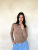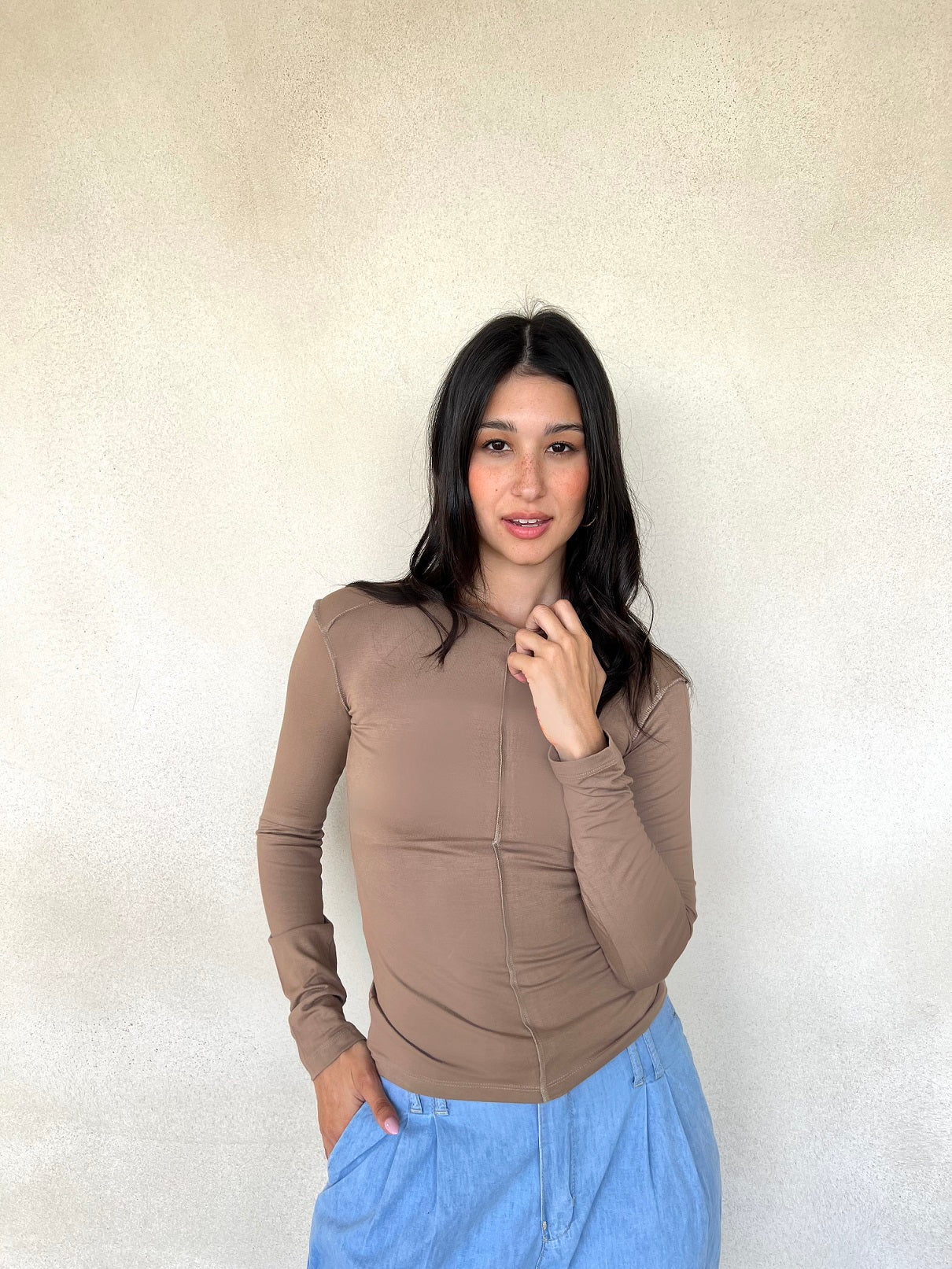 Round neck top with sleeves, featuring a line detail across the chest and on the shoulders.