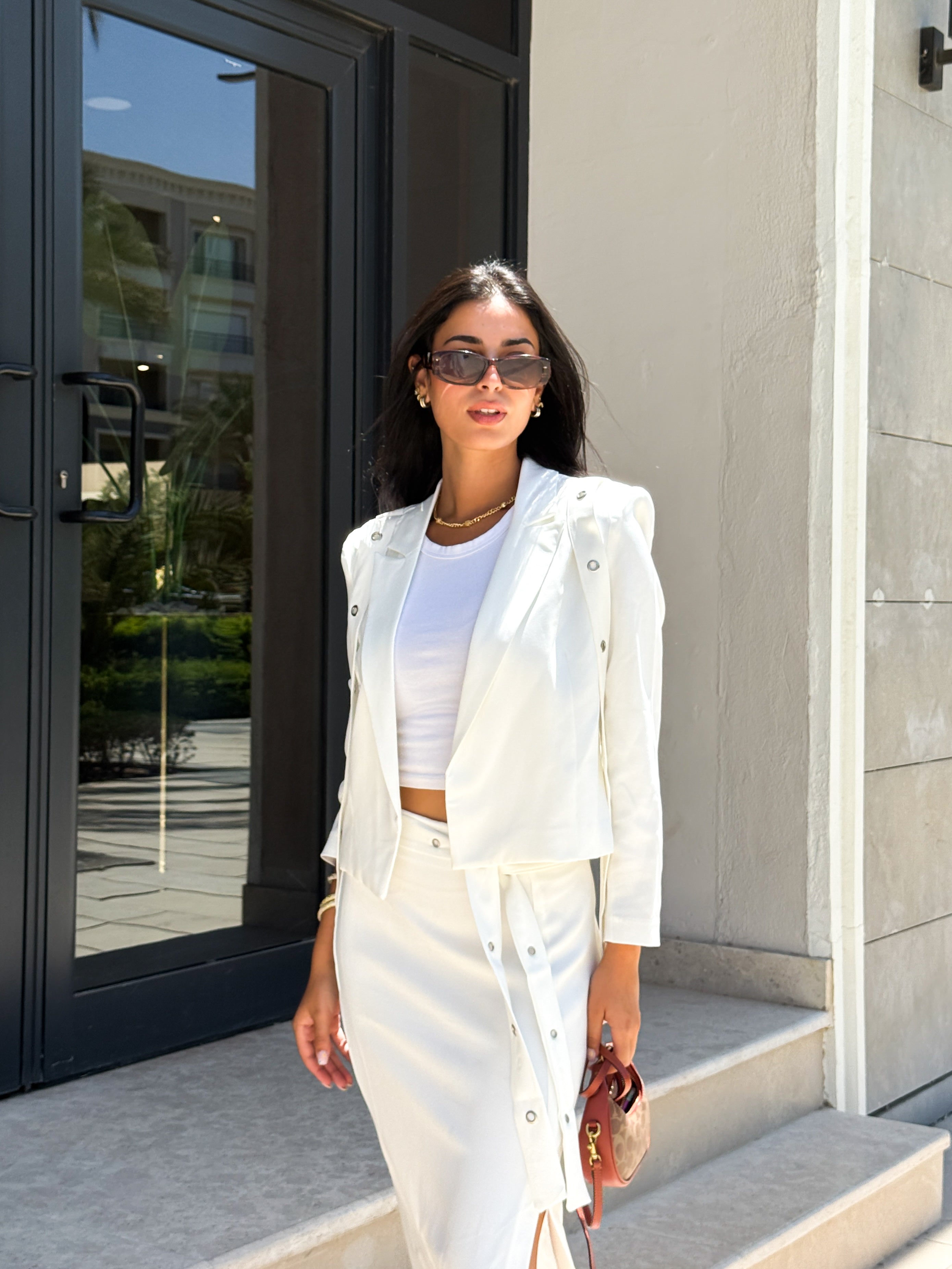 Chic long-sleeve blazer featuring two shoulder straps with snap buttons, adding a bold and modern twist to the look. Perfect for both casual and smart outfits.