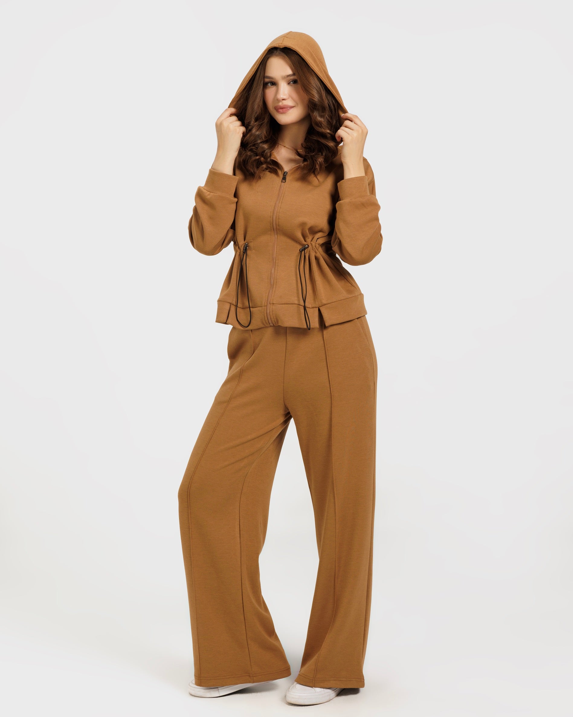 Casual two-piece set featuring a blouse with a waist drawstring and hood for a relaxed, trendy vibe. Paired with comfy straight-cut pants — perfect for everyday wear.