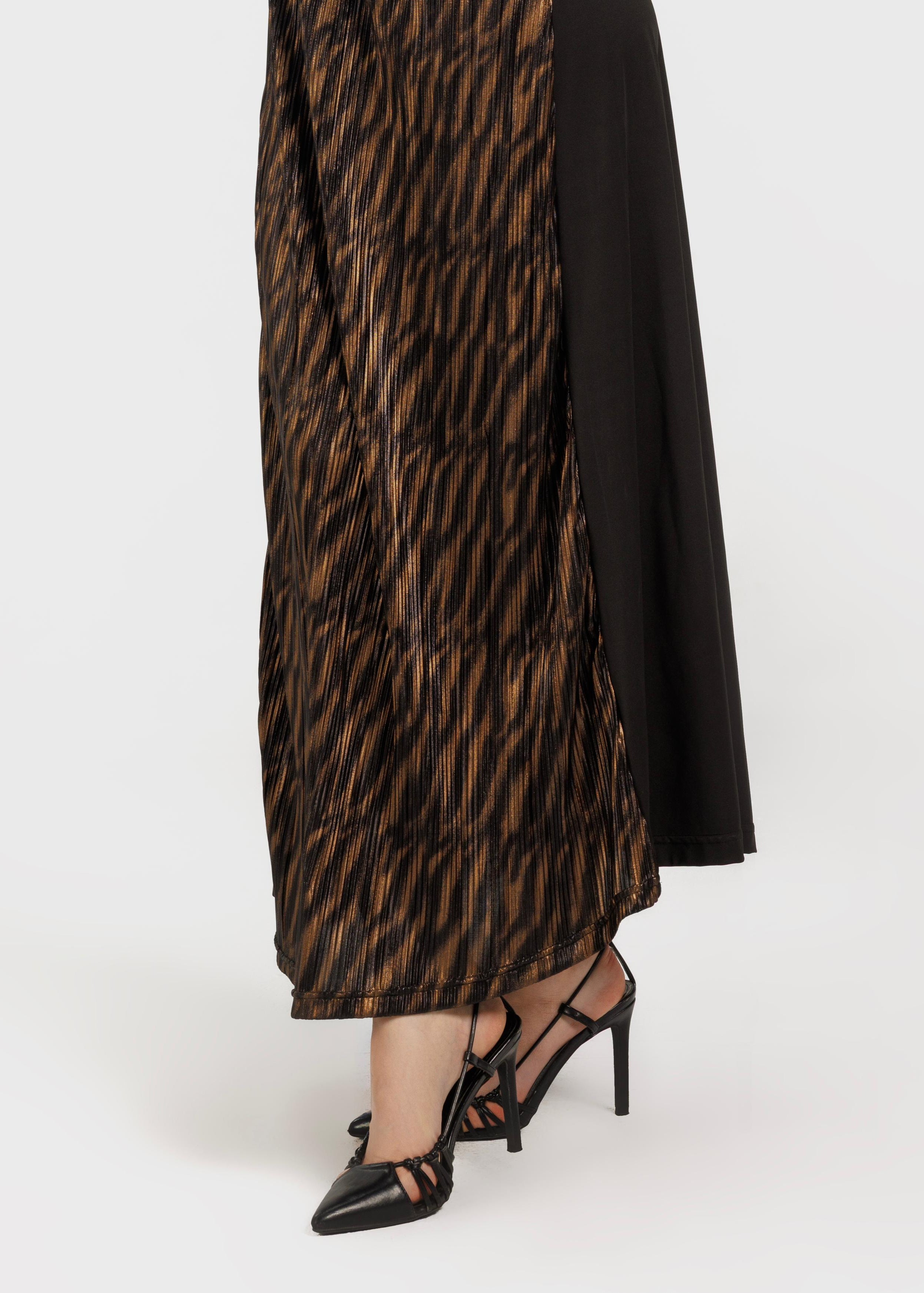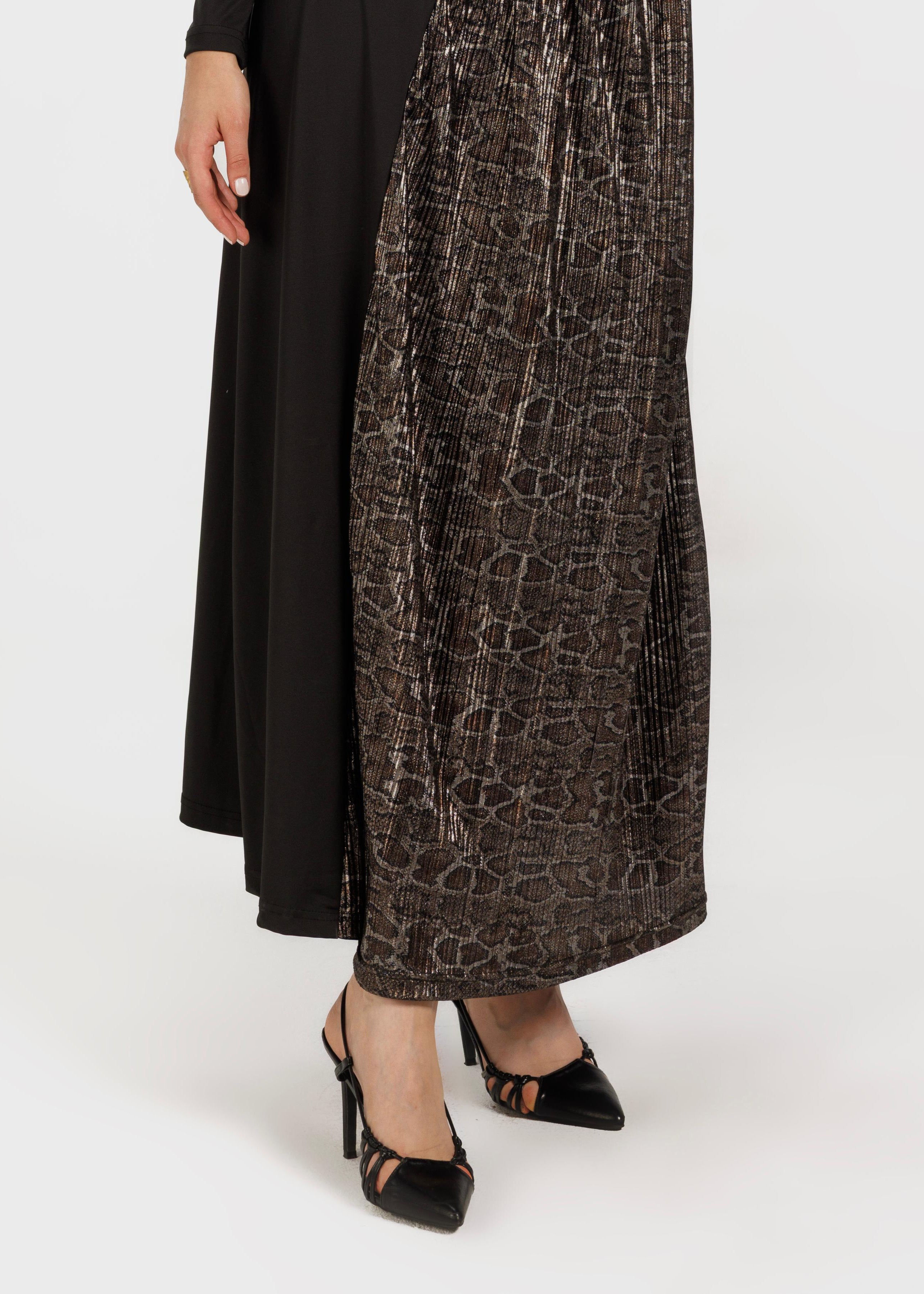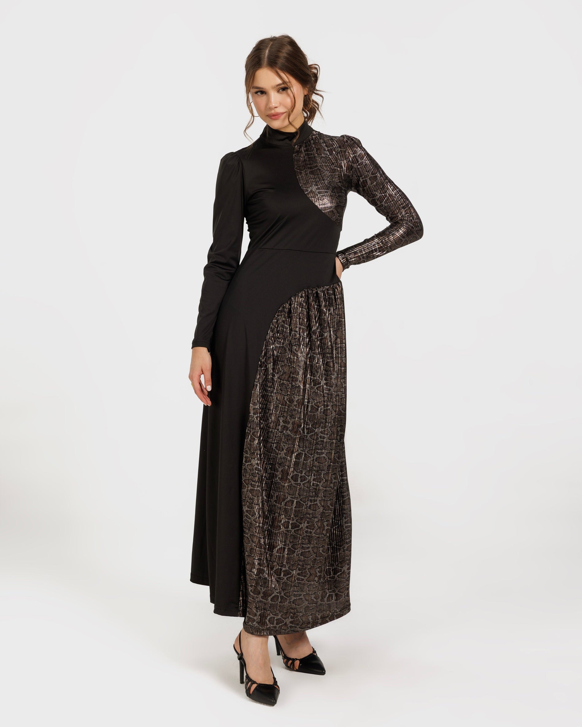 Black maxi dress with a mixed-fabric design, featuring a skirt in two contrasting fabrics and a chic high-low hemline — longer in the front and shorter at the back.