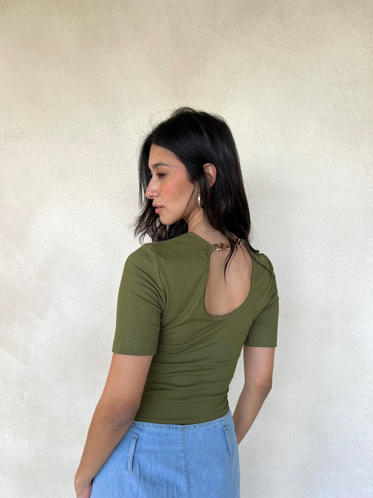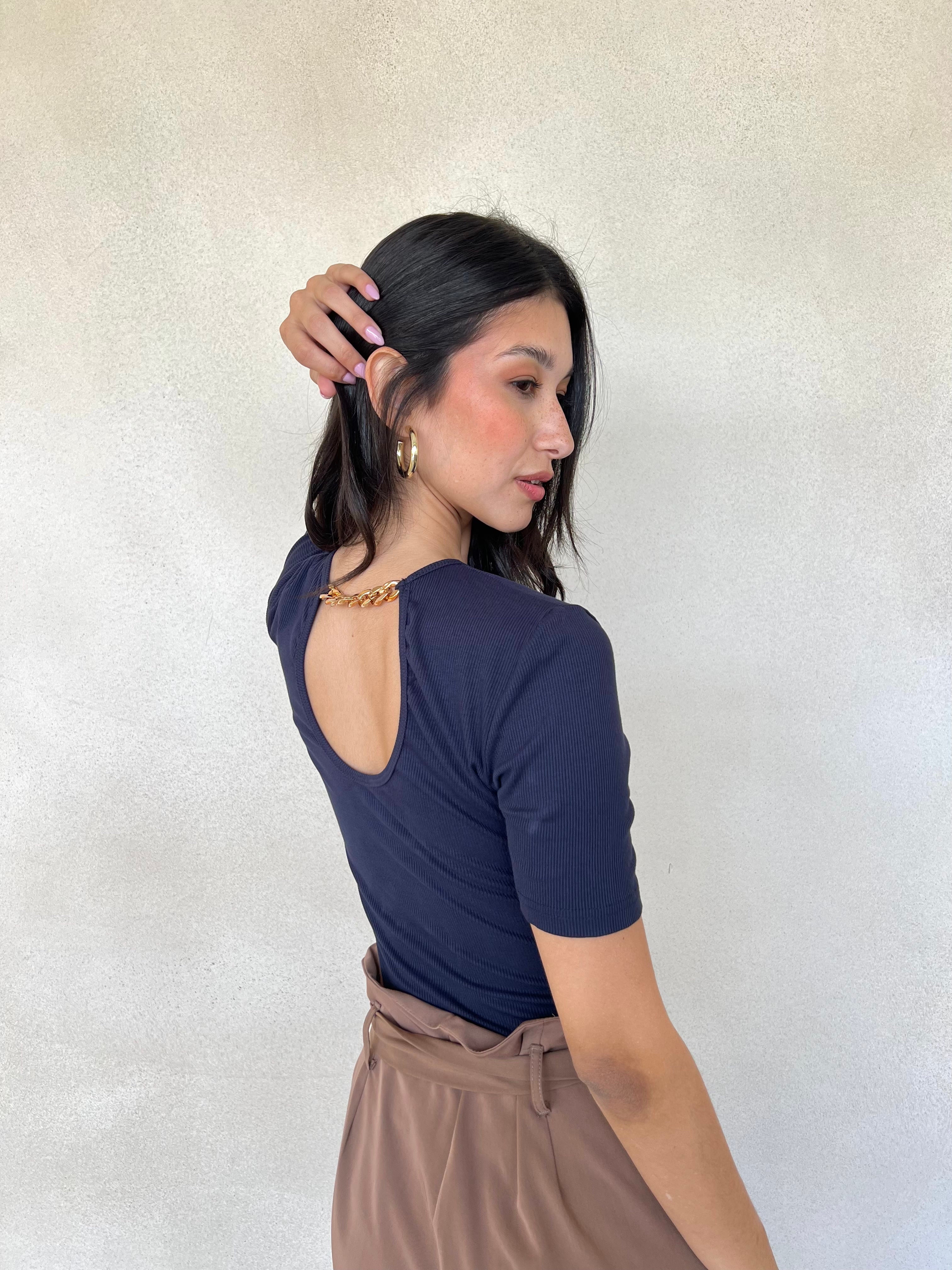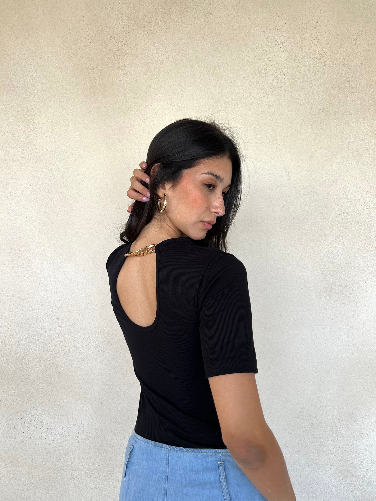 Beach cover-up top with back slit detail, featuring a chain embellishment on the opening, designed with snap fastenings at the bottom like a bodysuit for a secure fit