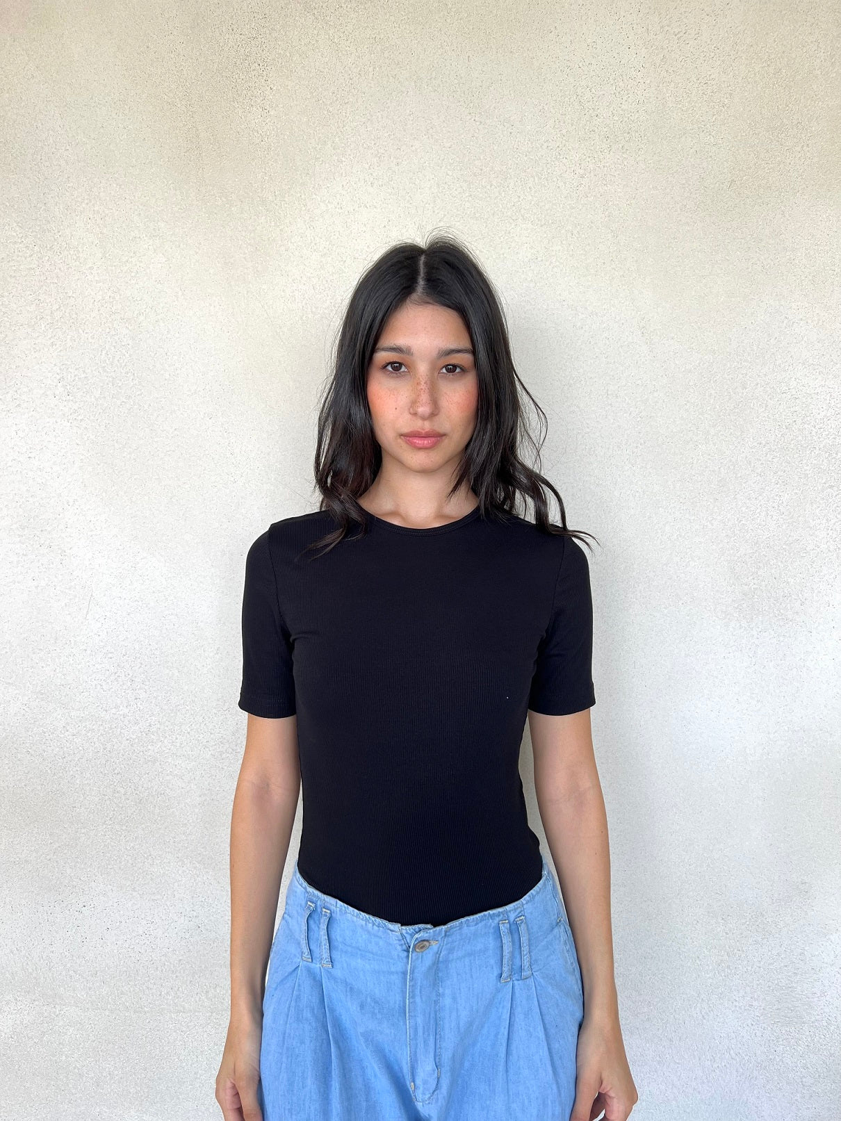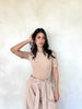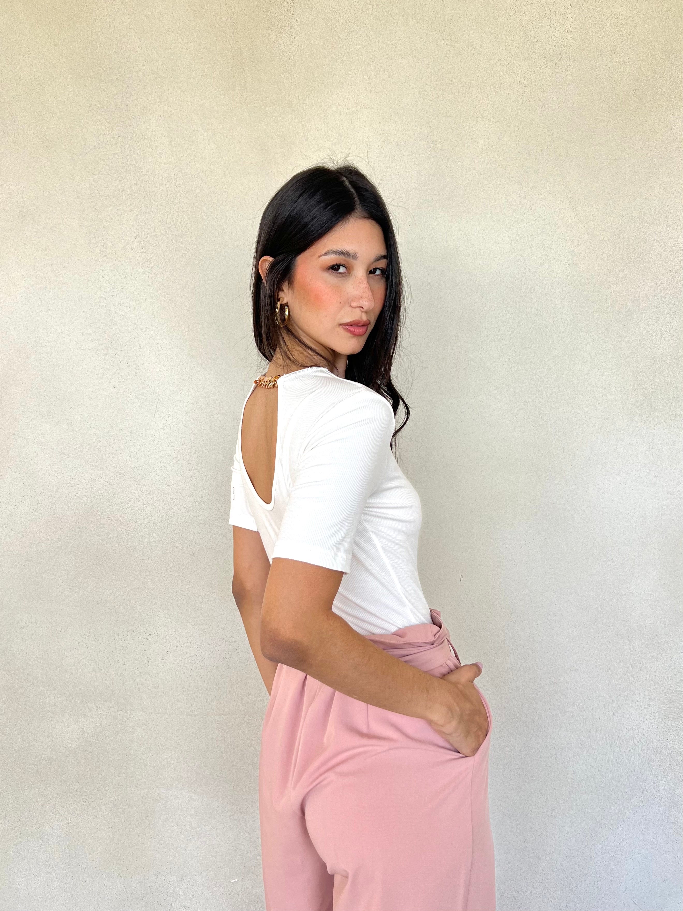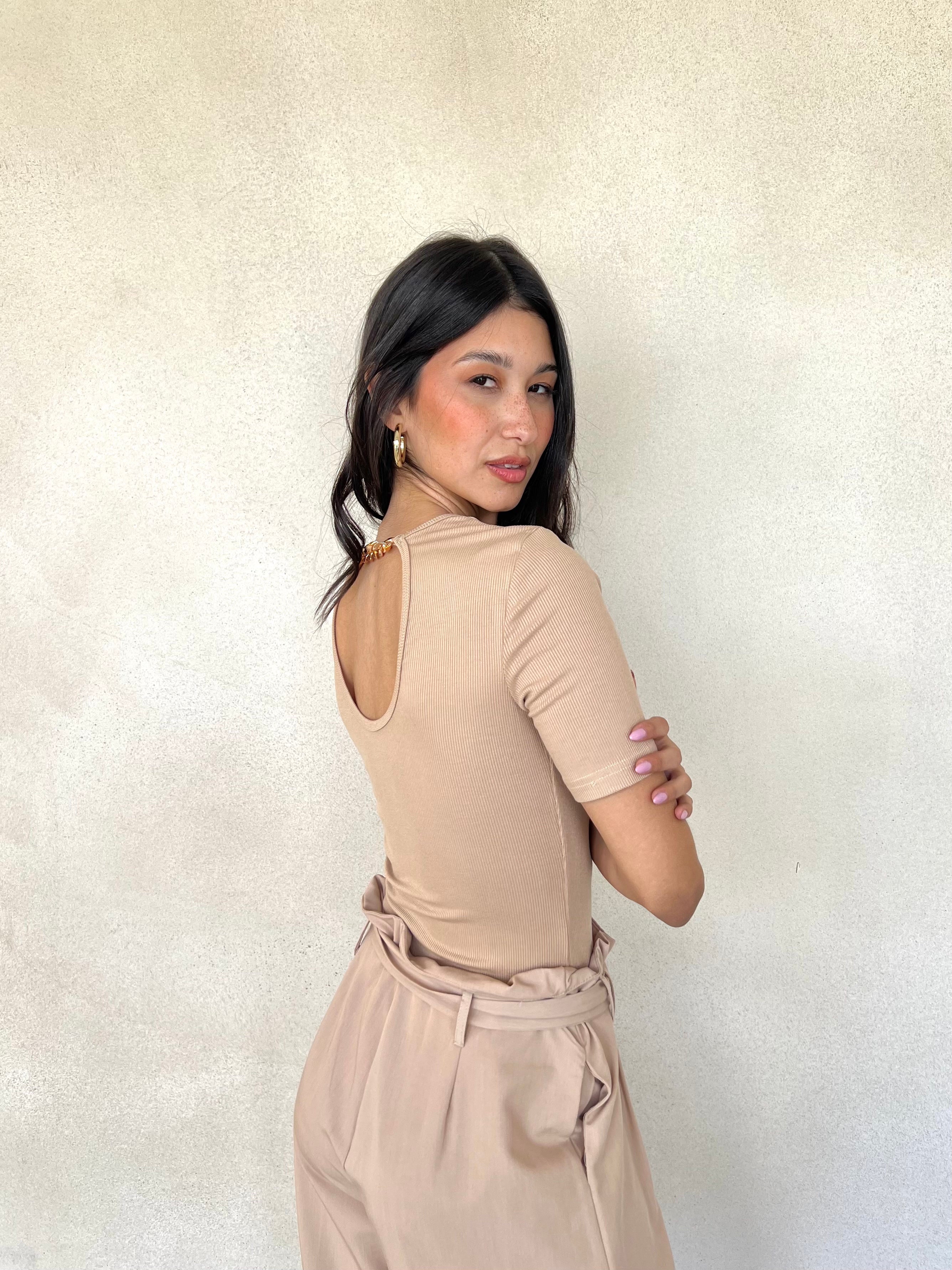 Beach cover-up top with back slit detail, featuring a chain embellishment on the opening, designed with snap fastenings at the bottom like a bodysuit for a secure fit