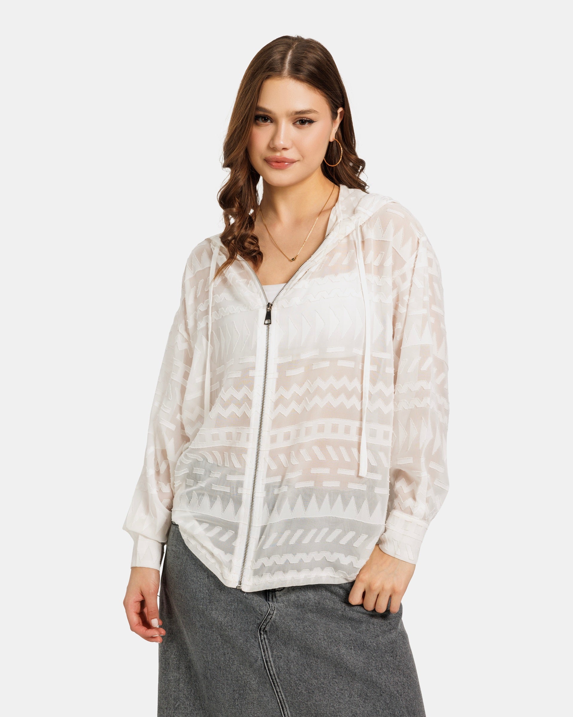 Sheer long-sleeve blouse with a hood and front zipper, adding a bold and trendy touch — perfect for layered or casual looks.