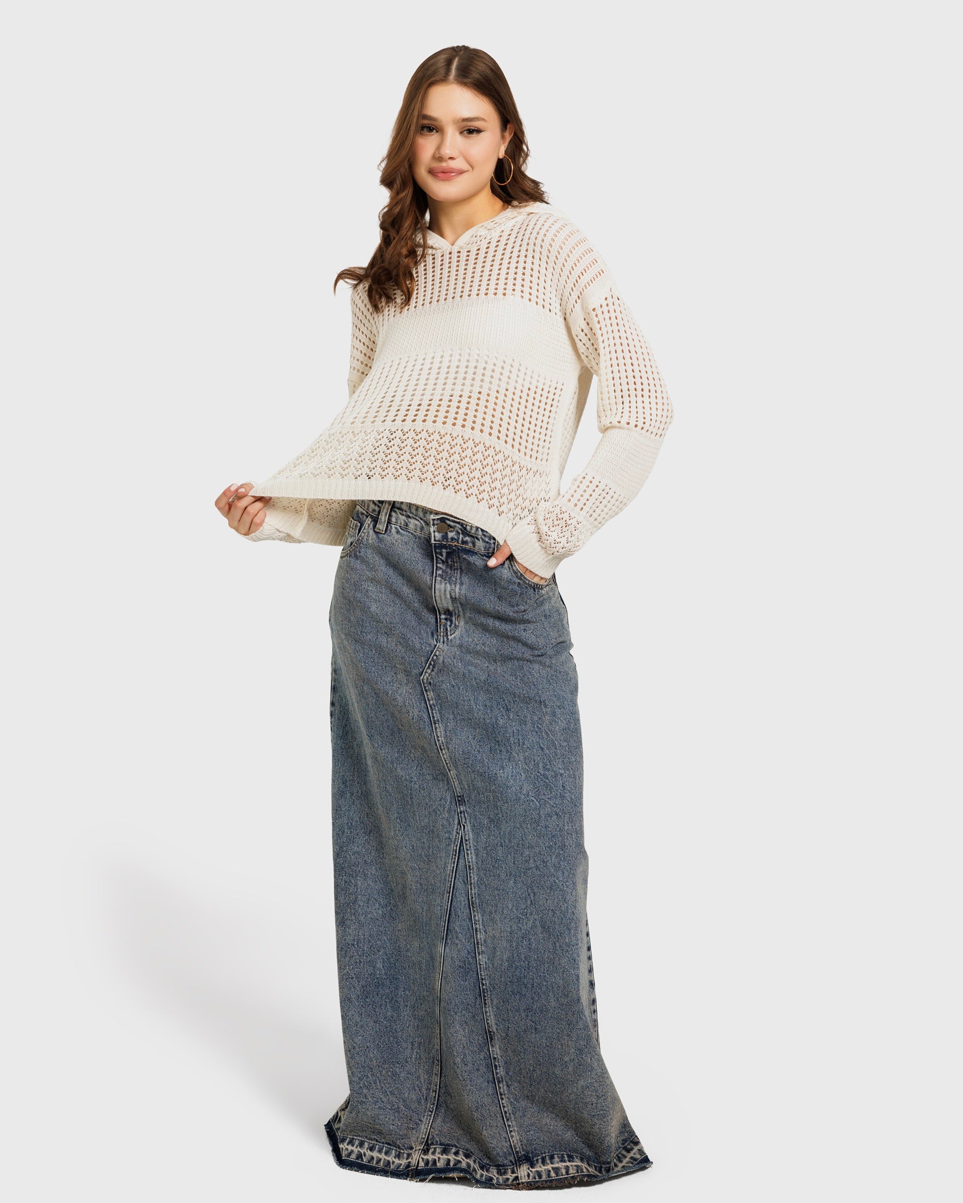 Knitted long-sleeve top made from soft, comfy fabric. Features a stylish hood (or high neck) for a trendy, casual vibe. Perfect for in-between weather and easy to style with jeans or trousers.