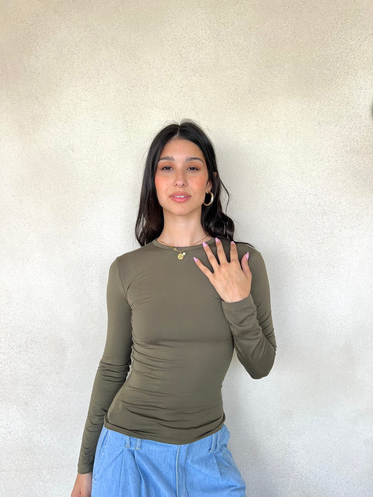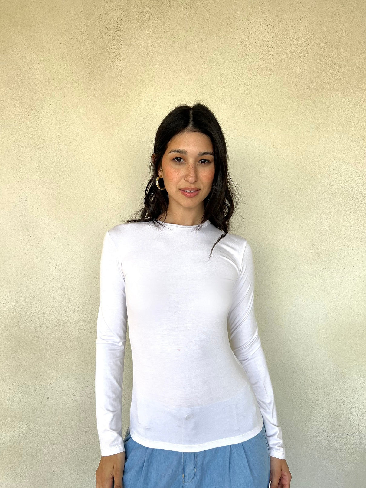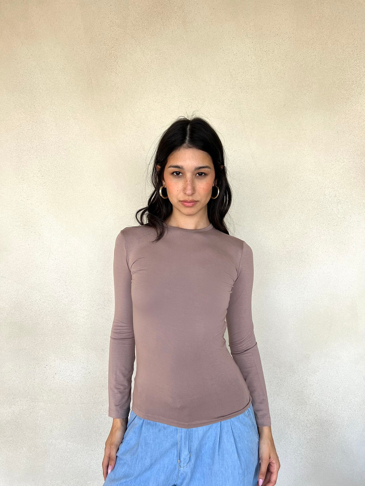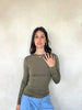 Round neck top with sleeves, simple and versatile design, perfect for casual or everyday wear."